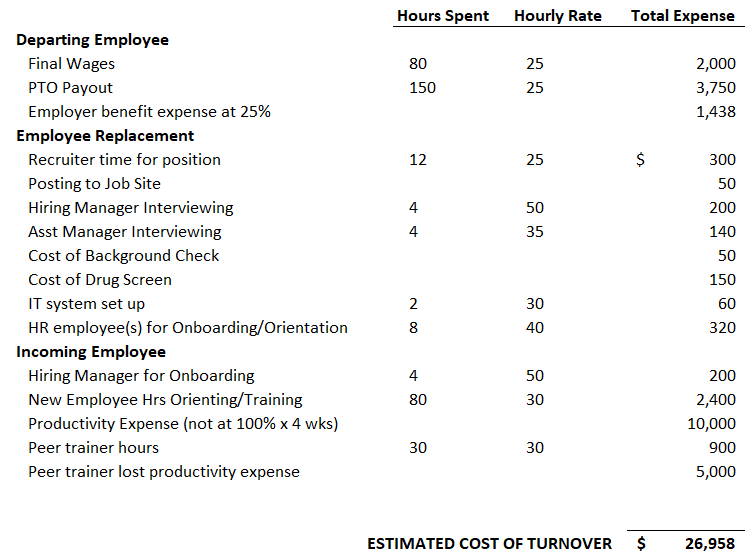 Back to calculating that tangible expense though… To calculate, you would want to assess each expense related with the hiring, onboarding, and training of an employee. Evaluate the hours put in times an hourly rate of the recruiter and hiring manager. How much time do your HR associates spend with a new hire times their hourly rate? What about training from a fellow employee or yourself with getting someone up to speed? And if you are in an enviornment that produces “widgets”, what delay in revenue is there associated with their ability to be at 100%? All those expenses should be factored in to a cost of turnover analysis and in the example of a widget producing employee, ultimately should look something like this: