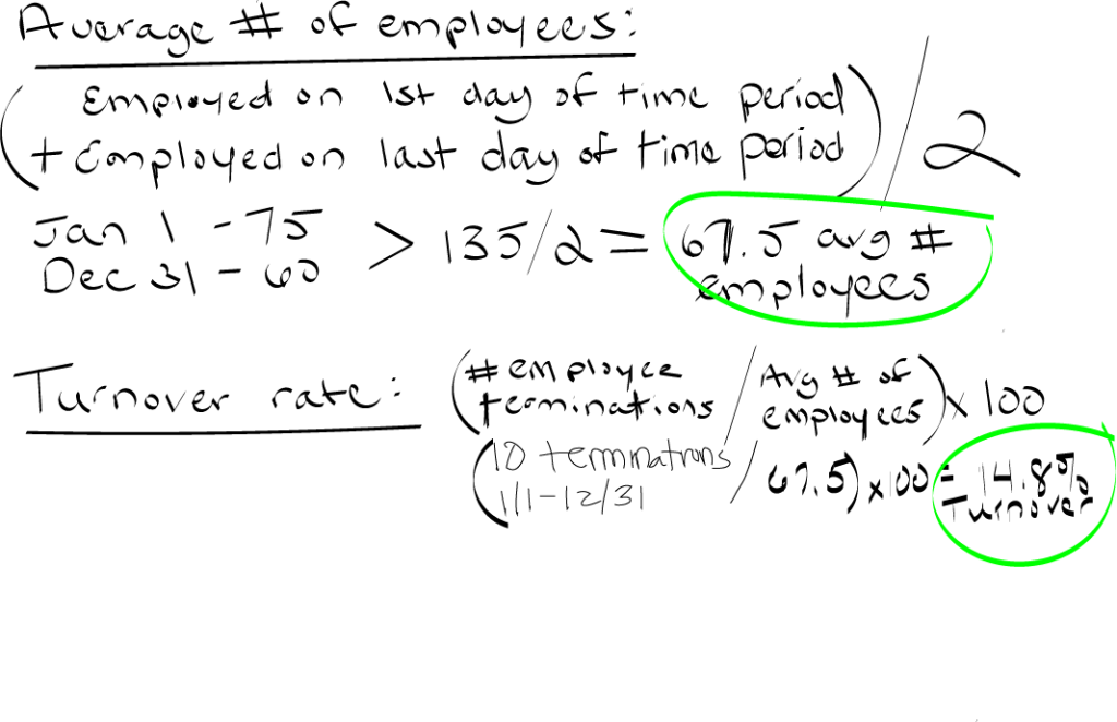 Let’s start with the first metric… turnover rate. When you determine what time period you want to measure (typically a calendar or fiscal year), first determine your average number of employees during that time. The easiest way to get that number would be to look at how many employees were active on day one of that time period, how many employees were active on the last day of that time period, divided by two.